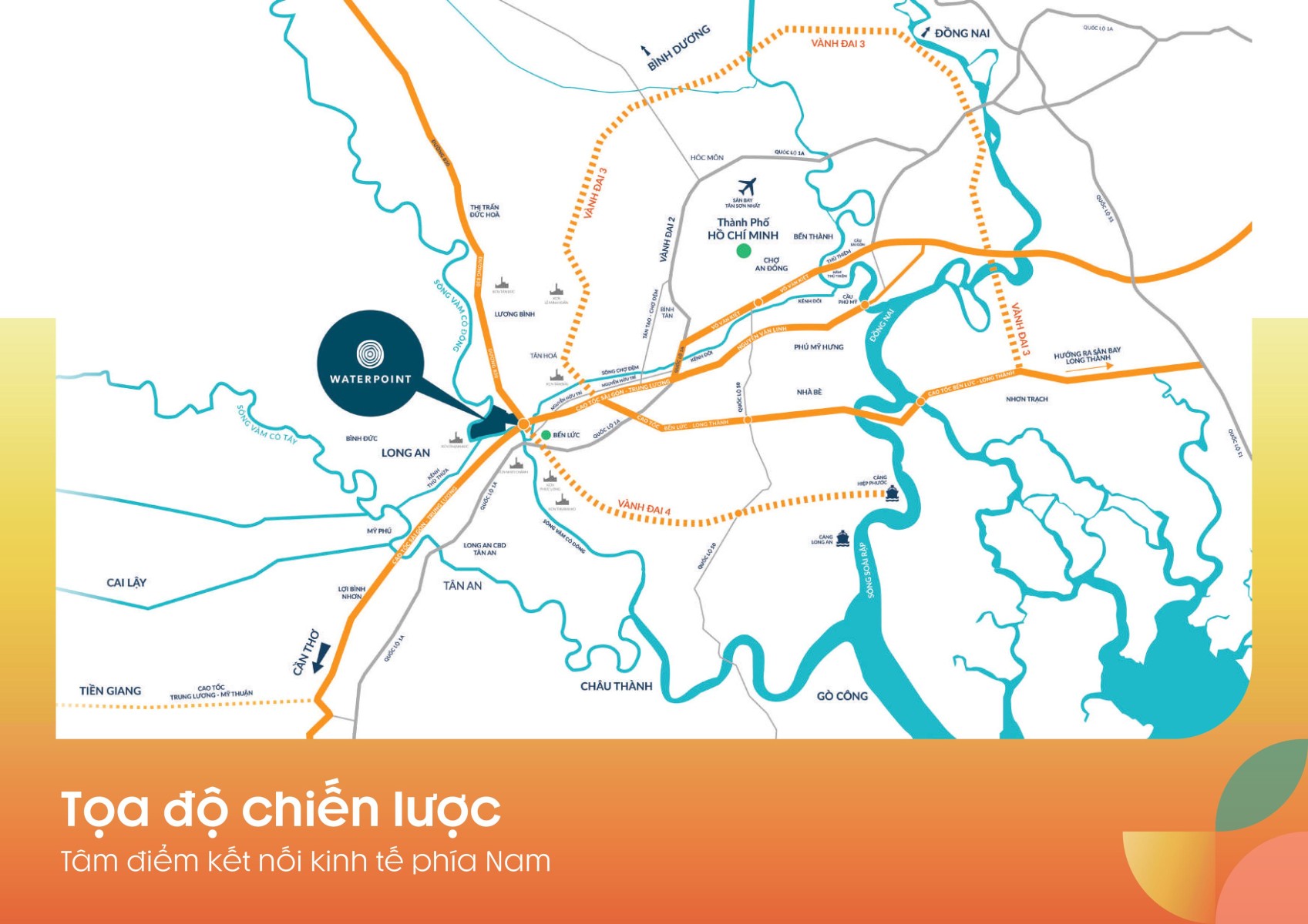 Solaria Rise tọa lạc tại khu đô thị Waterpoint ba mặt giáp sông, tại mặt tiền vành đai 4, thuộc Bến Lức, Long An – nơi có vị trí chiến lược, kết nối giao thông thuận tiện với các khu vực kinh tế trọng điểm tại TP.HCM và các tỉnh lân cận. Từ Solaria Rise, cư dân chỉ mất khoảng 30 phút di chuyển qua các tuyến đường huyết mạch như cao tốc Bến Lức – Long Thành và Vành đai 3 TP.HCM, giúp dễ dàng kết nối đến trung tâm TP.HCM, và các trung tâm quanh dự án.