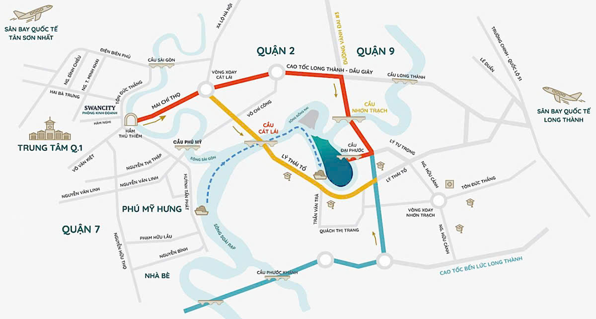 Sân bay Quốc tế Long Thành: trung tâm hàng không lớn nhất cả nước, thu hút dòng chuyên gia, doanh nhân, kỹ sư cao cấp. Các biệt thự ven sông như Elyse Island trở thành lựa chọn lưu trú, an cư lý tưởng.
