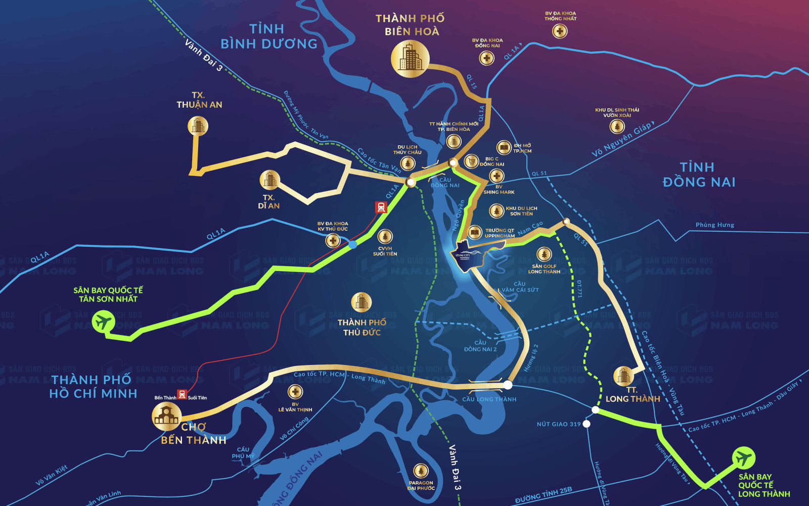 Izumi City sở hữu vị trí “vàng hiếm có” khi nằm ngay giao điểm kết nối giữa TP.Thủ Đức – Biên Hòa – Long Thành, trung tâm vùng kinh tế trọng điểm phía Nam.