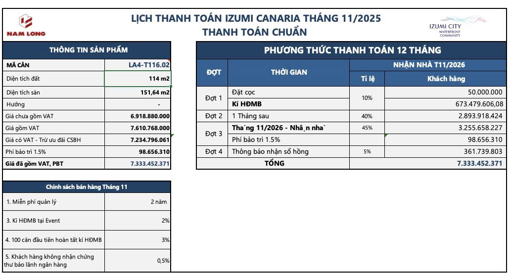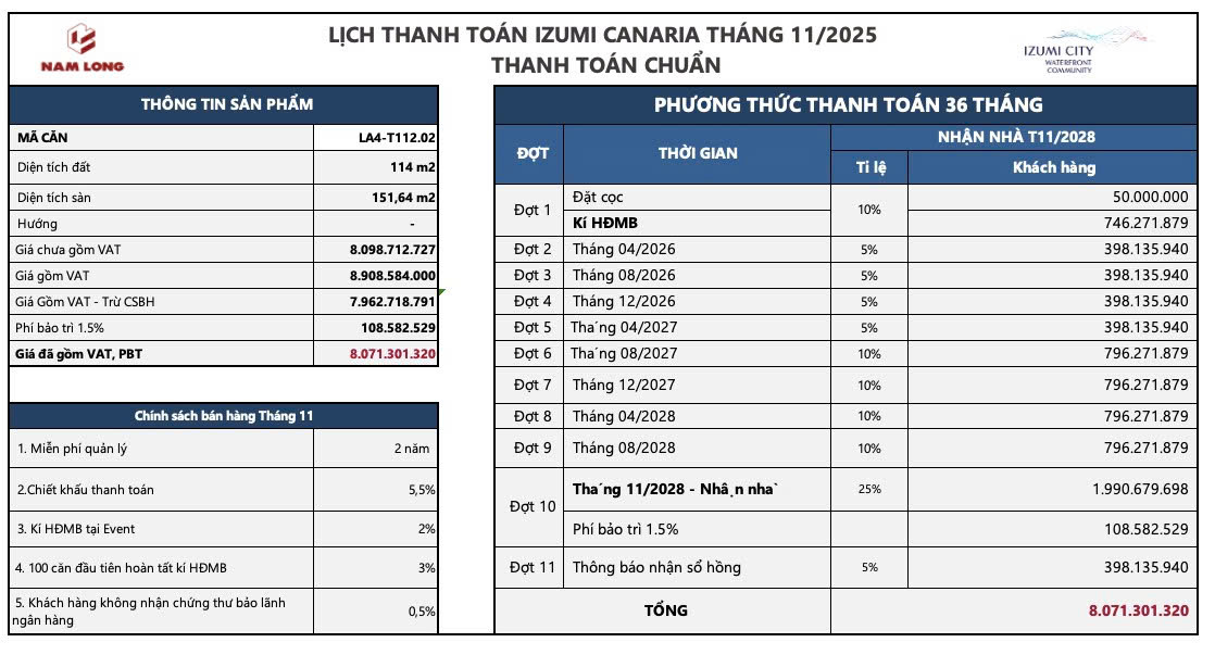 Đây là phương án dành cho khách hàng muốn chủ động tài chính dài hạn, chia nhỏ dòng tiền trong suốt 3 năm. Tiến độ thanh toán trải dài từ tháng 01/2026 đến tháng 11/2028, bao gồm 12 đợt thanh toán.